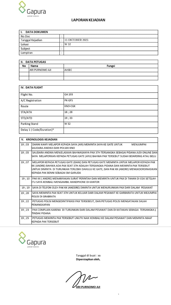 Garuda Indonesia nomor penerbangan GA 193 rute Bandara Kualanamu – Soekarno Hatta, Rabu petang (15/10/2025). Seorang penumpang bernama Iskandar, yang belakangan diketahui menjabat sebagai Ketua DPW Partai NasDem Sumatera Utara, sempat dipaksa turun oleh aparat penegak hukum atas dugaan terlibat dalam kasus judi online.